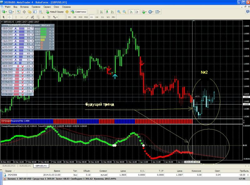 Смотрите на рисунке (ниже индикатора №2 кстати тоже предсказывающего тренд, но о нём в другой раз